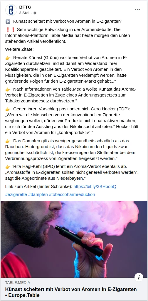 Jedenfalls klingt es bei beiden Verbänden so, als wäre es um ein spezielles Verbot von Aromen in Liquids gegangen, das initiiert werden sollte. Das BfTG erwähnt mit einem kleinen Satz noch: „Nach Informationen von Table.Media wollte Künast das Aroma-Verbot in E-Zigaretten im Zuge eines Änderungsgesetzes zum Tabakerzeugnisgesetz durchsetzen.“ Der VdeH erwähnt das gar nicht.
