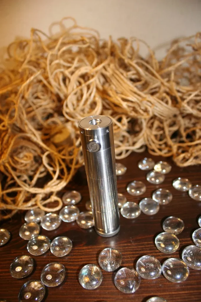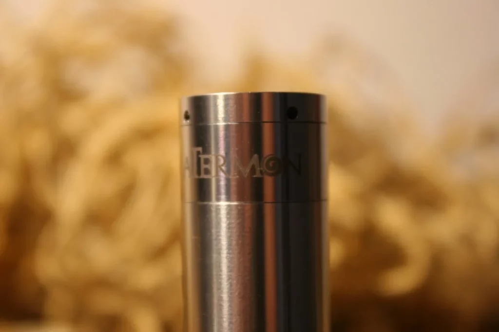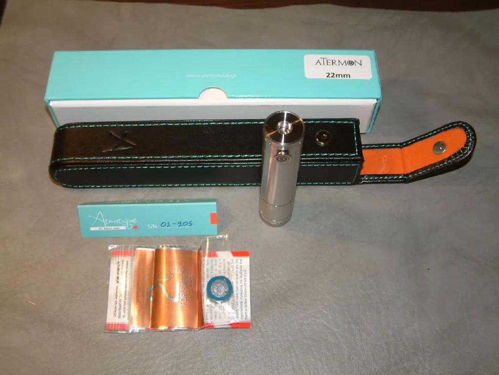 Der Atermon besteht aus einer Tube für 18650er Akkus, einer Bottom-Cap, sowie einer kombinierten Topcap-Taster-Einheit mit 510er Anschluss. Bottom-Cap, Tube und Schaltergehäuse bestehen aus Edelstahl 304L. Der Atermon ist wahlweise mit 22 mm oder 23 mm Durchmesser erhältlich und erlaubt damit eine übergangslose Montage sehr vieler Verdampfer. Eine 18350er-Tube ist separat für 15 Euro erhältlich, ebenso eine Erweiterungs-Tube für 10 Euro zur Verwendung eines Kick oder zur Verlängerung der 18350er Tube für 18500er Akkus.
