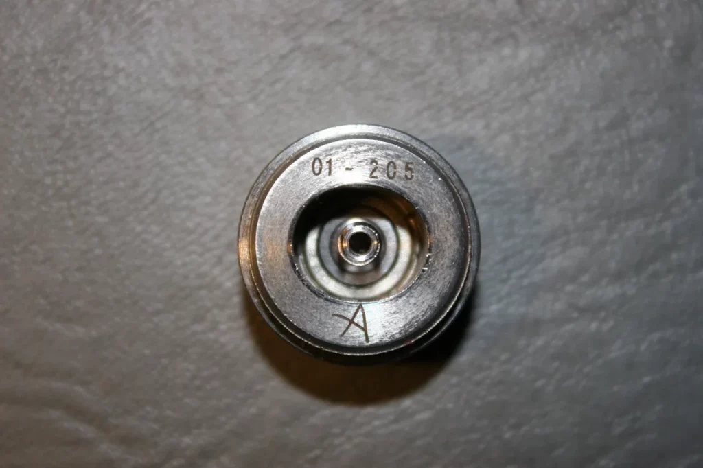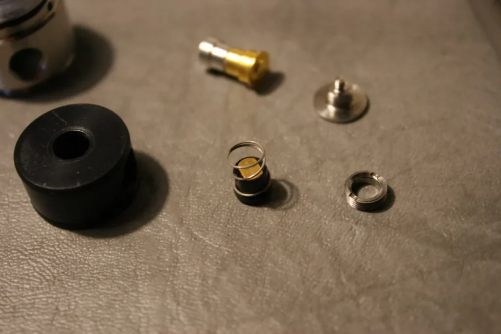 Sämtliche vergoldeten bzw. mit Rhodium beschichteten Kontaktflächen sind ausgesprochen wartungsarm und die Reinigung ist ganz leicht mit sauberen Fingern oder einem weichen Tuch durchführbar. Das Zerlegen des Tasters ist sehr unkompliziert. Man schraubt den Tasterkopf aus der Kunststoffführung. Nun wird ein geschlitzter Gewindering sichtbar, der jedoch nicht fest angeknallt ist (und bei Zusammenbau auch nicht fest angeknallt werden sollte). Dieser lässt sich mit der Fingerspitze heraus drehen. Er muss jedoch nicht vollständig entfernt werden, um das Kunststoff-Gehäuse aus der Tastereinheit heraus zu schieben. Drückt man mit einem Schraubendreher vom 510er Anschluss aus auf den Pluspol, so lässt sich dieser aus der Bohrung drücken. Mit einem geeigneten Werkzeug (Nadel einer Nadelflasche oder ein dünner Feinmechaniker-Schraubendreher) lässt sich nun der Kunststoff-Einsatz nach unten heraus schieben. Er ist mit O-Ringen in der Hülse gelagert. Nun lässt sich seitlich die Kunststoffführung der Kontaktplatte samt Feder entnehmen, die Platte und der Bolzen können gereinigt werden und anschließend erfolgt der Zusammenbau in umgekehrter Reihenfolge. Aufgrund der verwendeten Materialien ist eine Wartung des Schalters aber ausgesprochen selten nötig. Beim Zusammenbau ist darauf zu achten, dass die Achse der wippend gelagerten Kontaktplatte horizontal ausgerichtet wird. Das hört sich jetzt deutlich komplizierter an, als es in der Realität ist. Das Zerlegen und Zusammenbauen ist ausgesprochen einfach und die ganze Prozedur dauert keine zehn Minuten.