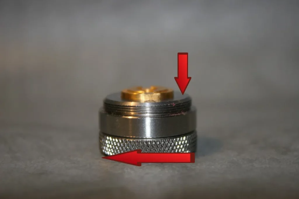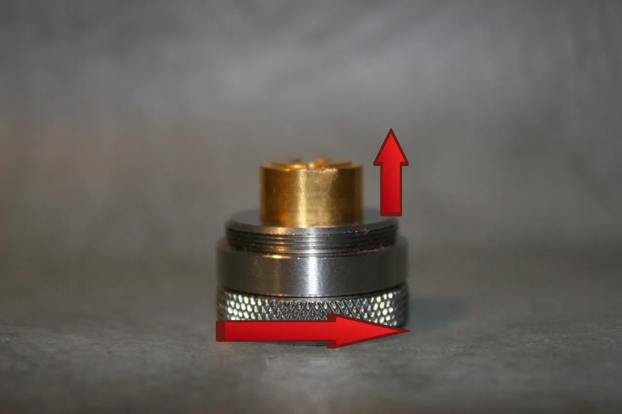 Die an der Bottom-Cap befindliche Schraube ist ebenfalls endlos in beiden Richtungen drehbar, ohne dass sie ihre vertikale Lage ändern würde. Diese Schraube greift in eine Bohrung des Kontaktbolzens mit Innengewinde, so dass dieser aus der Bottom-Cap heraus- oder hineingeschraubt werden kann. Die Höhenverstellung geschieht somit vom Außen und führt nicht zu einer Spaltbildung am eigentlichen Körper des Akkuträgers. Ein wirklich neues Konzept, dass die Bedienung des Atermon ausgesprochen komfortabel macht. Ein ständiges Auf- und Zuschrauben zur Justierung innen liegender Schrauben zur Höhenverstellung, wie es bei sehr vielen anderen Akkuträgern erforderlich ist, entfällt. Man dreht die äußere Rändelschraube entgegen dem Uhrzeigersinn, um den Akku zu fixieren bzw. im Uhrzeigersinn, um die Fixierung zu lösen. Damit ist gleichzeitig eine Lockingfunktion realisiert, um den Akkuträger bei Transport vor unbeabsichtigtem Feuern zu schützen. Sicherlich ist dann der Akku in der Tube nicht mehr fixiert und er ist dann beweglich in der Tube, jedoch ist diese derart massiv ausgeführt und so präzise gefertigt, dass es sich nicht in nervigem Klappern äußert. Außerdem reicht eine wirklich geringfügige Lockerung des Pol-Bolzens, um den Akkuträger „abzuschalten“.