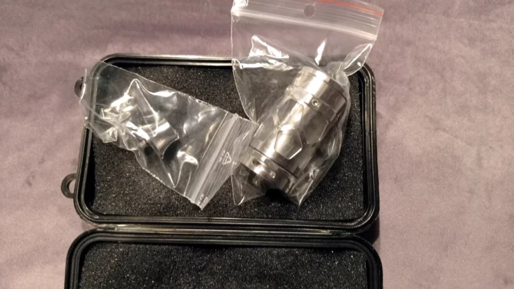 Dem eigentlichen Verdampfer liegen darin das 510er Widebore DripTip, zwei Tütchen mit Ersatz-O-Ringen, Schräubchen und einem Inbusschlüssel, sowie ein kleines Faltblatt u.a. mit QR-Code für das Manual bei.