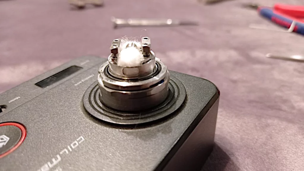 Nun… dann halt mehr Watte. Ich habe beim Abschneiden des Strangs gut einen Zentimeter über die AFC-Außenkante Watte belassen und sie in die Kammern verfrachtet. Klar… die Fenster waren dicht. Allerdings war das schon ein eher „deutliches“ Gestopfe. Und ich hatte die Befürchtung, dass der Nachfluss abreißen könnte. Die Menge und Kompaktheit der Watte in den Kammern hätte bei anderen, nach ähnlichem Prinzip funktionierenden Verdampfern, für ein garantiertes Trockenlaufen gesorgt.