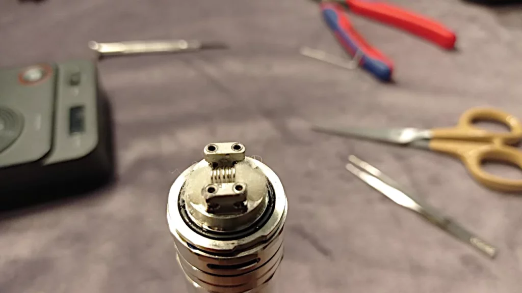 Also… beim GT V passt und muss ordentlich Watte in die Kammern. Und die Liquidfenster müssen von dieser auch gut und ganzflächig verschlossen werden. Ansonsten kann er absaufen… oder beim Befüllen durch den Überdruck „die Klospülung“ machen. Im Manual wird als Tipp mitgegeben, die Watteenden mit der Pinzette sogar einzurollen und diese Rolle in die Kammern zu schieben. Das hat den Vorteil, dass die Watte von sich aus schon ausreichend gegen die Liquidfenster drückt.