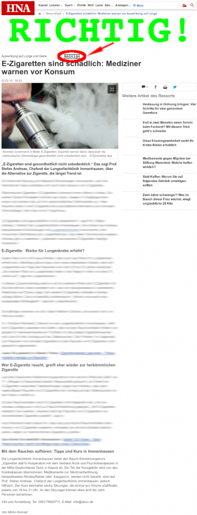Abgesehen davon, dass in dem vermeintlich redaktionellen Artikel der Hessischen/Niedersächsischen Allgemeinen (HNA) vom 02.02.2019 eine Anhäufung von Bullshit zum Thema Liquidverdampfer verbreitet wird (lungenschädlich / könnte ja vielleicht Lungenkrebs verursachen / Nikotin ist höchst suchterzeugend / wer dampft, fängt das Rauchen wieder an), müsste der Beitrag auch mit der Kennzeichnung „Werbung“ oder „Anzeige“ versehen sein, denn nichts anderes ist es: