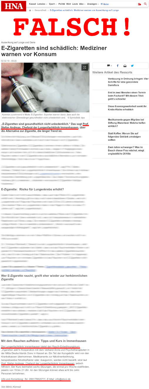 Prof. Stefan Andreas, Chefarzt der Lungenfachklinik Immenhausen, ist hier die Quelle des E-Dampf-Bashing-Artikels, in dem die Nutzung von Liquidverdampfern, vorgeblich belegt durch aus dem Zusammenhang gerissenen Forschungsergebnissen oder höchst eigenwilliger Interpretation solcher, als gesundheitlich höchst riskant dargestellt wird. Dann wird noch die Behauptung aufgestellt, E-Dampfen wäre für die Raucherentwöhnung völlig ungeeignet (komisch, gerade erst wurde eine gegenteilige Studie veröffentlicht… die wird halt ignoriert), um dann im letzten Absatz knallhart für die Raucherentwöhnungsprogramme des Professors und der Klinik, in der er arbeitet, zu werben… mit Beschreibung der Kurse, Hinweisen auf Erstattungsmöglichkeiten der Krankenkasse, sowie Uhrzeiten der Kurse und Kontaktangabe inkl. Rufnummer.
