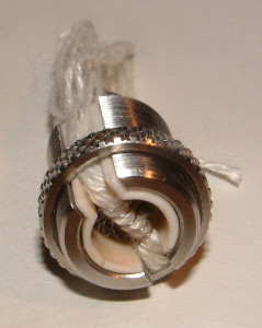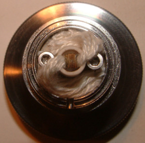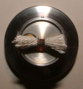 Die Schnur ist im Vergleich zu den bisher von mir genutzten Fasern sehr dünn. Ich musste sofort an das Häkelgarn meiner Frau denken, das sie zum Filet-Häkeln verwendet. Die Farbe ist ein helles Beige und die Oberfläche ist sehr glatt, beinahe seidig. Nun hatte ich zuvor schon aus Neugier das Video von Dirk „Obi“ Oberhaus zum Thema Bambusschnur gesehen und wusste, was da auf mich zu kommt. Als erster Verdampfer musste der FeV2 her halten. Den betreibe ich nun schon seit einiger Zeit mit Baumwoll-Garn, weil ich das Gefühl habe, dass Watte aufgrund der horizontalen Lage und den leicht darauf drückenden Dochten doch recht schnell „in sich zusammen sackt“ und der Nachfluss dann nicht mehr stimmt. Mit Watte kann ich den FeV2 problemlos ungefähr drei Tage betreiben, danach macht sich zunehmend ein Liquidabriss (eher Liquid-Mangel) bemerkbar, den man zwar durch Zuhalten des Luftlochs für eine gewisse Zeit wieder beseitigen kann, der aber immer öfter auftritt. Mit neuer Watte bestückt, ist das Problem dann beseitigt. Baumwoll-Garn hingegen hält da deutlich länger durch und ich muss es meist erst austauschen, wenn die Microcoil ohnehin einen 3börn nötig hat. Was lag also näher, als den FeV2 mit der Bambus-Schnur zu bestücken. Das Einfädeln mittels Draht ist absolut unproblematisch… die sehr glatte Oberfläche des Garns ist dabei sicher auch ein entscheidender Faktor. Vor Inbetriebnahme wurde die Faser und die Wicklung schon einmal mit Liquid benetzt… und dann kam der Test. Bei den ersten vier bis fünf Zügen habe ich einen leichten Beigeschmack feststellen können. Der war aber nicht so unangenehm, wie man es von verschiedenen Glas- oder Silikatfasern kennt, die nicht restlos von Schlichte befreit sind. Ich würde den Geschmack als ein wenig „karamellig“ bezeichnen. Nach einigen Zügen ist er, wie gesagt, weg und ich konnte keine Geschmackseinbußen gegenüber Watte oder Baumwoll-Garn feststellen. Der Nachfluss ist ebenfalls vergleichbar gut.