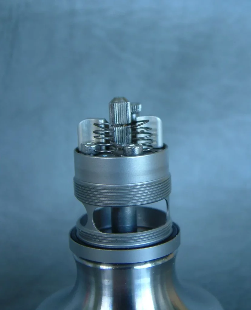 Über die Verdampferkammer-Hülse wird der AFC-Ring – ebenfalls aus Edelstahl – geschoben, der zwei Bohrungen aufweist. Dieser wird durch die aufschraubbare Topcap aus Edelstahl fixiert. Die Topcap ist auch ausgesprochen durchdacht konstruiert. Einerseits weist sie Kühlrippen auf, was zu einer spürbaren Abkühlung des Dampfes führt. Konstruktionsbedingt ist ja bei Top-Coil-Verdampfern ein relativ warmer Dampf zu erwarten, jedoch wird er durch die Konstruktion der Topcap wirklich effektiv abgekühlt. Andererseits ist die Topcap innen domförmig ausgeführt, was die Verdampferkammer zusätzlich verkleinert. Die Topcap weist eine Bohrung für 510er Driptips auf, die sehr exakt ausgeführt ist. Ich hatte mit keinem Driptip Probleme bezüglich der Passgenauigkeit.