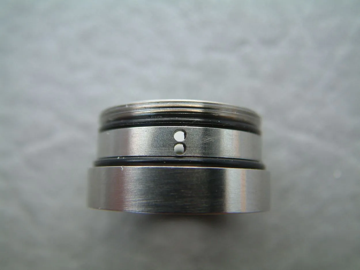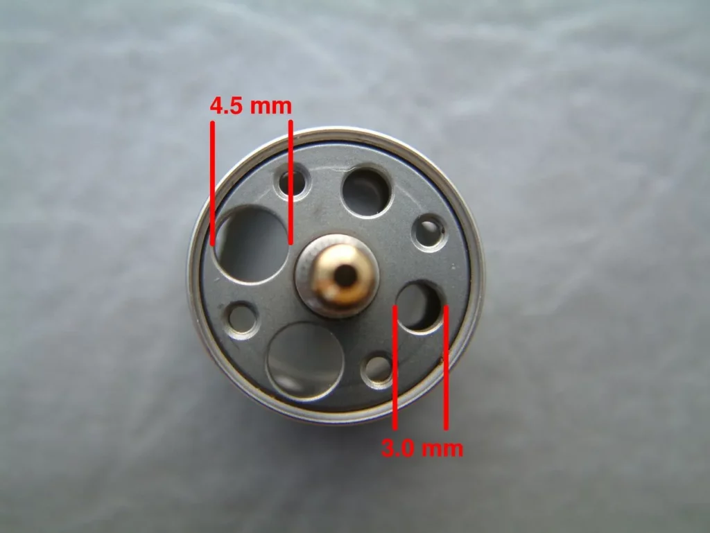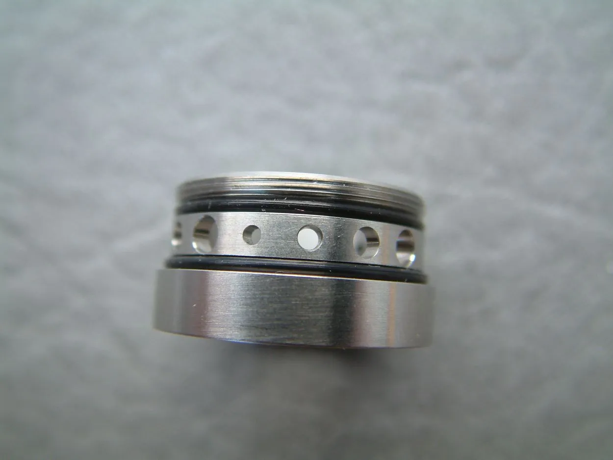 Die eigentliche Verdampferkammer besteht wieder aus Edelstahl und weist ebenfalls diverse Bohrungen für die Airflow auf… insgesamt zehn. Jeweils in zweifacher Ausführung sind Bohrungen mit 1.2 mm, 1.5 mm, 2.0 mm und 2.5 mm vorhanden, die mit dem AFC-Ring entweder für Dualcoil auch zweifach geöffnet sind, oder für Singlecoil nur einfach. Zusätzlich ist ausschließlich für den Singlecoil-Betrieb ein gestacktes (übereinander ausgeführtes) Doppelloch mit 2 x 1.2 mm vorhanden.