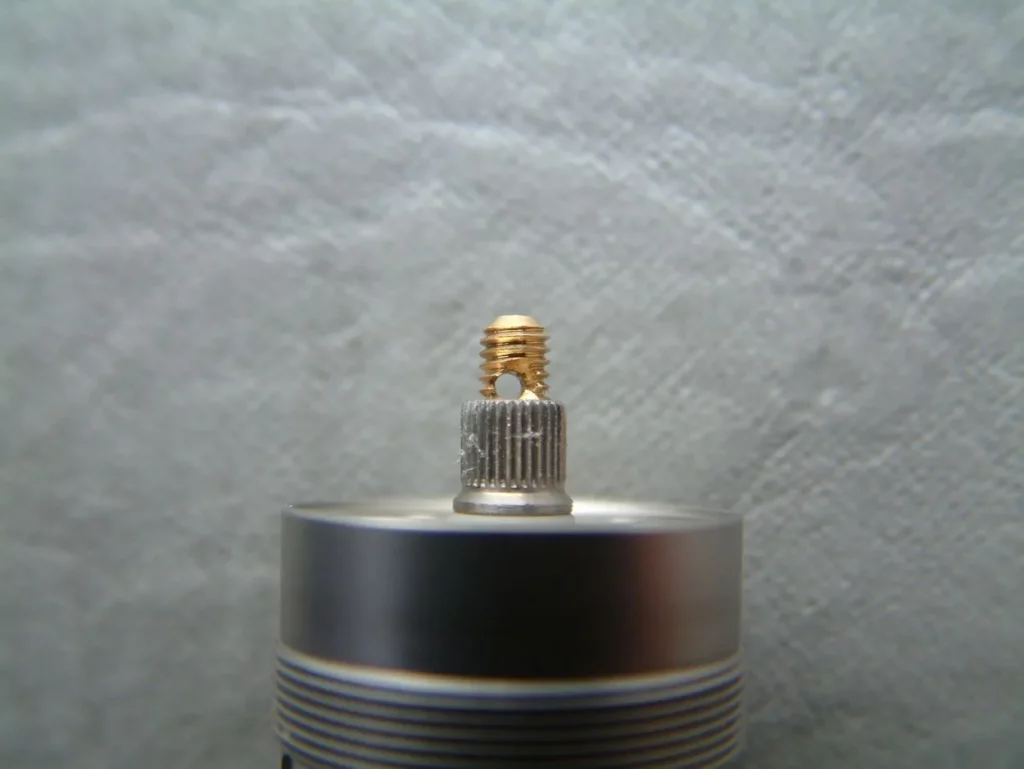 Zunächst einmal muss man sagen, dass der Origen kein „reinrassiger“ Genesis-Verdampfer ist, sondern ein echter „Zwitter“… Genesis UND Faserverdampfer. Norbert hat sich dafür wirklich etwas ausgedacht, als er das Deck designt hat. Schaut man sich dieses an, so denkt man „Loch an Loch und hält doch.“ Nicht weniger als neun Bohrungen befinden sich im Deck, wobei die zentrale Bohrung durch den Messing-Pluspol belegt ist. Der Draht wird am durchbohrten Pluspol mit einer Rändelmutter befestigt. Neben dem zentralen Pluspol-Loch sind dann noch vier kleine Bohrungen mit Gewinde und vier größere ohne Gewinde vorhanden. Die kleinen Löcher sind für die Schrauben vorgesehen, die den Minuspol bilden, die großen sind die Durchlässe für Faser bzw. ESS (Seil geht natürlich auch). Für den Edelstahl-Betrieb sind die Löcher mit dem etwas kleineren Durchmesser von 3 mm vorgesehen, die größeren mit 4.5 mm für die Verwendung mit Faser. Das Deck ist mit dem Rahmen für den Tank fest verbunden, die Tankhülse wird darüber geschraubt und dichtet oben und unten mit einem kleinen O-Ring ab. Tankrahmen und Deck bestehen aus Edelstahl. Die Gewinde sind als Feingewinde ausgeführt. Ich bin nach wie vor immer noch vollkommen aus dem Häuschen, wie leicht sich der Eingang zum Gewinde finden lässt (quasi von selbst) und wie glatt und geschmeidig die Gewinde laufen. Sonst können Feingewinde ja schon fuddelig sein, was den Eingang anbelangt. Beim Origen ist das nicht der Fall. Der Messingpluspol an der Basis ist nicht verstellbar aber sehr gut eingestellt, so dass er bei nahezu allen Akkuträgern (die meist eh einen verstellbaren Pluspol haben) sehr guten Kontakt findet.