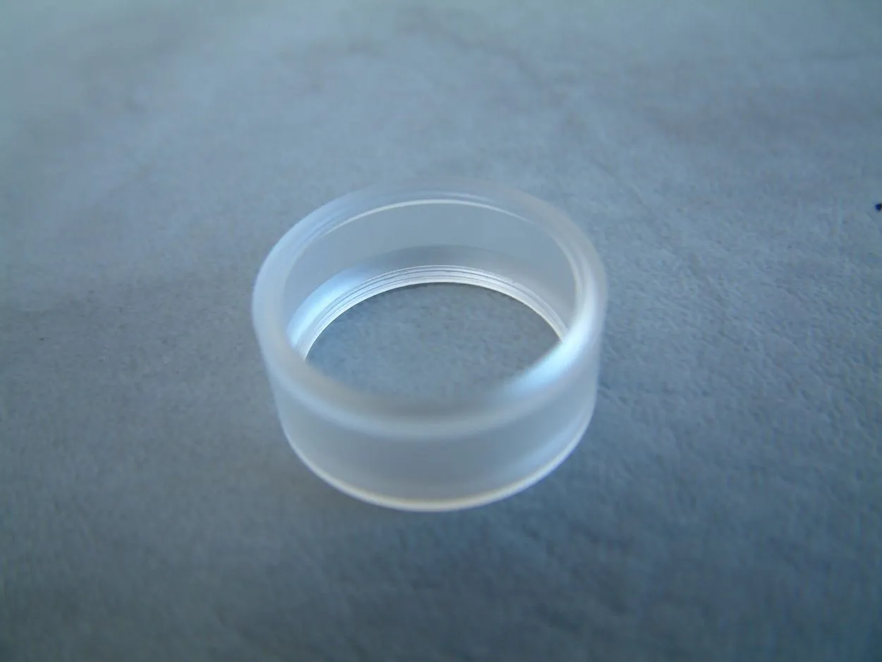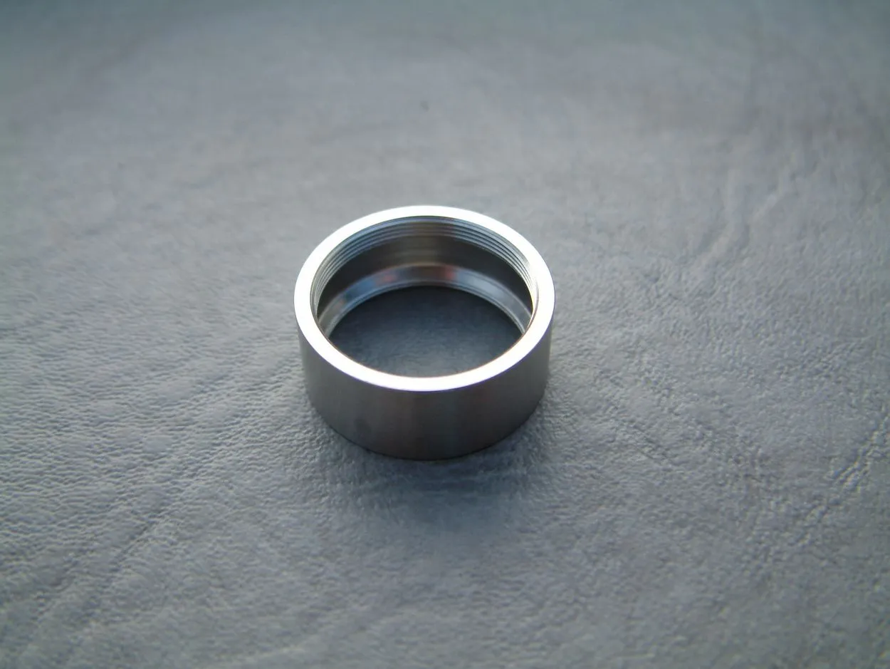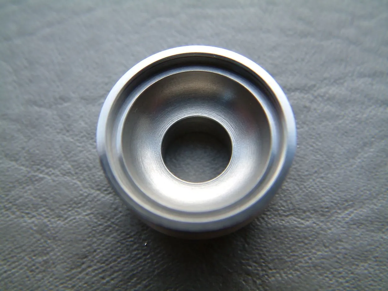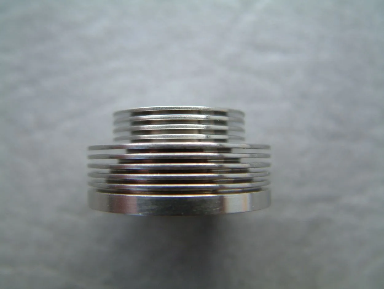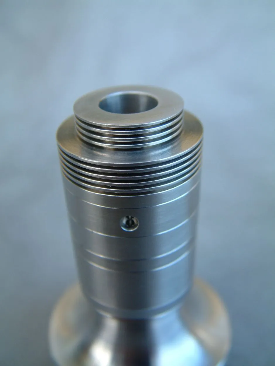 Über die Verdampferkammer-Hülse wird der AFC-Ring – ebenfalls aus Edelstahl – geschoben, der zwei Bohrungen aufweist. Dieser wird durch die aufschraubbare Topcap aus Edelstahl fixiert. Die Topcap ist auch ausgesprochen durchdacht konstruiert. Einerseits weist sie Kühlrippen auf, was zu einer spürbaren Abkühlung des Dampfes führt. Konstruktionsbedingt ist ja bei Top-Coil-Verdampfern ein relativ warmer Dampf zu erwarten, jedoch wird er durch die Konstruktion der Topcap wirklich effektiv abgekühlt. Andererseits ist die Topcap innen domförmig ausgeführt, was die Verdampferkammer zusätzlich verkleinert. Die Topcap weist eine Bohrung für 510er Driptips auf, die sehr exakt ausgeführt ist. Ich hatte mit keinem Driptip Probleme bezüglich der Passgenauigkeit.