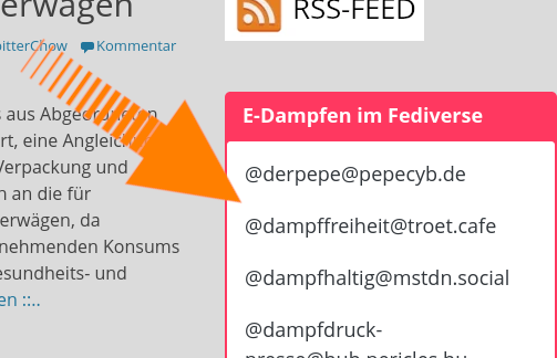 Na wenn es vielleicht doch noch einige schaffen, sich im Fediverse einzufinden und dann Beiträge (Links, Statements, kurze Beiträge etc.) zum Dampfen, aber auch zu allem anderen, was sie interessiert (wird doch in den Fachforen auch immer mehr gemacht) veröffentlichen, dann landet auch der Content zum Dampfen außerhalb der Blase und kann für eine andere Wahrnehmung des E-Dampfens sorgen.