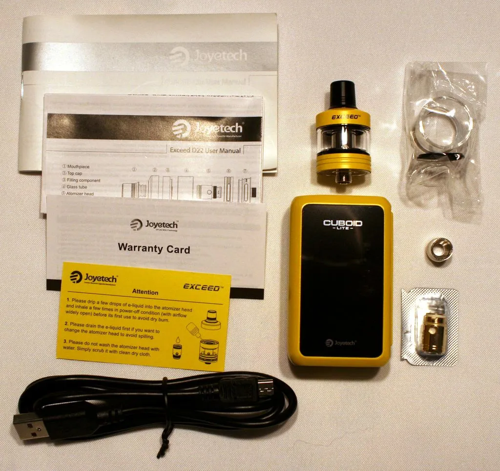 Als Einsteigergerät habe ich mir den Box-Mod Cuboid Lite mit dem Tankverdampfer Exceed D22 von Joyetech vorgenommen. Die Kombination gibt es als Set, das schon einige Zeit auf dem europäischen Markt eingeführt und im Fachhandel für knapp 60 bis 80 Euro zu haben ist (als Vergleich: für das eGo-C Set hatte ich Januar 2012 knapp 90 Euro hinlegen müssen).