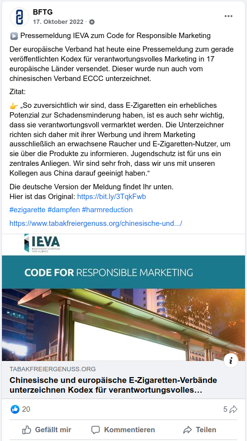 Dustin Dahlmann ist auch Geschäftsführer des Bündnisses für tabakfreien Genuss (BfTG) und der Independent European Vapers Alliance (IEVA), dem europäischen Händlerverband für E-Zigaretten. Mitglied in der IEVA ist auch der Verband des E-Zigarettenhandels (VdeH) und das BfTG. „Tabakfrei“ ist die IEVA also nicht. Geht es also um Rügen wie der Europäischen Komission zu intransparenten Kontakten mit Tabakunternehmen (vermeldet durch Reuters), fällt auch die IEVA darunter.