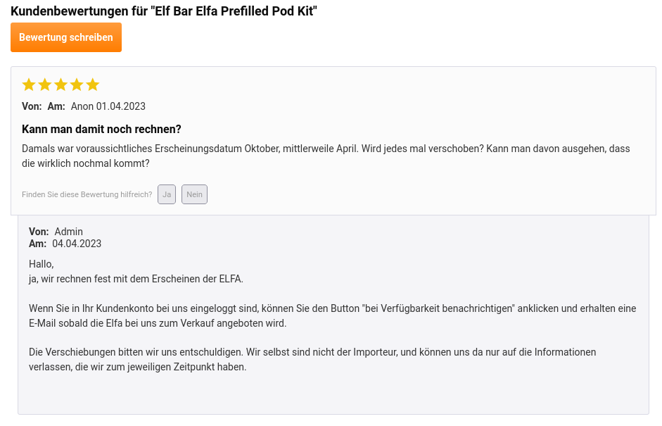 - Der Preis ist nicht „heiß“. Wenn der billige Einweg Schrott weiter für vermeintlich billig billig an jeder Straßenecke zu haben ist, aber die Elfbar ELFA eben nicht, und der Untersatz und 2 Pods nicht merklich weniger kosten, als alle anderen Einweg Marken, dann bleibt der Kunde zum Wohlgefallen des margenorientierten Handels auch mehrheitlich dabei.