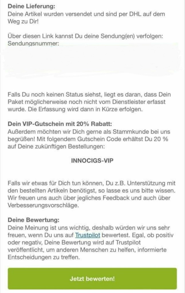 Einweg E-Zigaretten werden seit Ende 2021 sehr agressiv in der BRD unter die Menschheit gebracht und dieses Beispiel zeigt: das geschieht von ganz großen Namen aus dem Herzen des Fachhandels heraus. Die Ware bei Innocigs ist ab einem Bestellwert von 15 € versandkostenfrei zu erhalten gewesen. Für 15 € kann man bis heute noch versandkostenfrei bestellen.