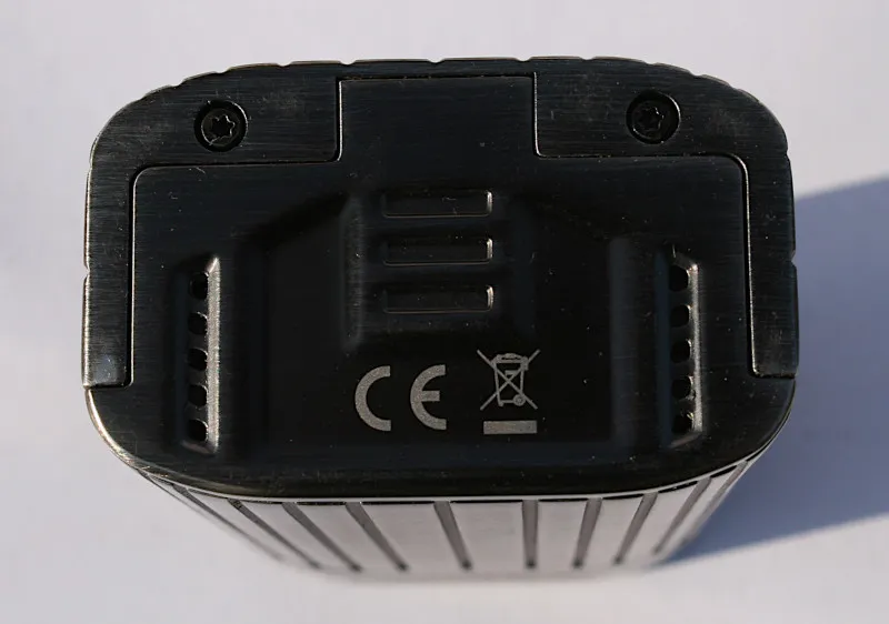 Am Boden des Akkuträgers befindet sich der Deckel des Akkufachs, das sich durch seitliches Schieben und Aufklappen öffnen lässt. Im Deckel befinden sich „+“ und „-“ Symbole für die korrekte Polung der Akkuzellen. Hier finden sich auch ausreichend dimensionierte Entgasungslöcher.