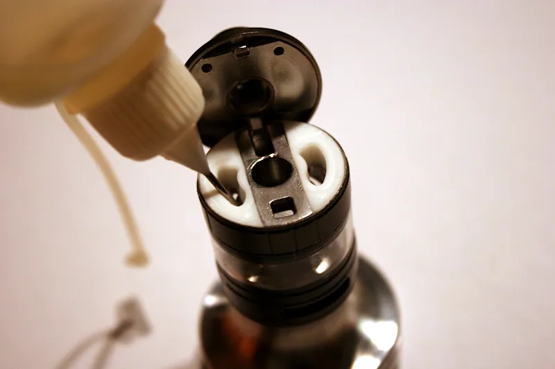 Die Nachfüllvorrichtung ist eine nette mechanische Spielerei… man schiebt den Deckel der Topcap zuerst, wie auch beim ProCore Air, ein Stück zur Seite und klappt ihn dann aber nach oben… eine echt nette Sache, die mir wirklich gefällt. Solchermaßen geöffnet, werden zwei große Einfüllöffnungen erreichbar.