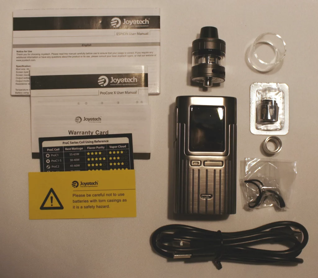 Die Lieferung erfolgt natürlich wieder im „Joyetech-Karton“. Darin befinden sich der Akkuträger Espion, der Verdampfer ProCore X mit vorinstalliertem 2-ml-Glastank und ProC1-Verdampferkopf (0,4 Ohm), ein 4,5-ml-Glastank mit erforderlicher Kaminverlängerung (Extended vent pipe), ein Ersatz-Verdampferkopf ProC1-S (0,25 Ohm), ein Ladekabel USB-A zu Micro-USB-B, ein Tütchen mit Ersatz-O-Ringen und Tankdichtung, sowie die Manuals zu Verdampfer und Akkuträger. Das Set ist für um die 80 Euro erhältlich.