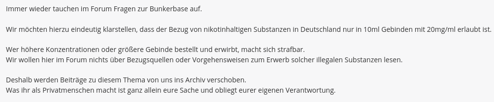 Ich stehe auf dem gleichen Standpunkt wie die meisten Forenbetreiber und Verantwortlichen für Dampferforen. Tipps und Austausch zum Erwerb von Bunkerbase sind Themen, die nicht unbedingt in öffentlich einsehbaren Bereichen von Dampfer-Foren diskutiert werden sollten. Aber halt nicht, weil der Erwerb illegal, also strafbar wäre, sondern, weil das Themen sind, welche die Dampfer-Szene in ein schlechtes Licht rücken („Ja seht Ihr, das sind alles doch Kriminelle, die mit verbotenen Produkten rummachen.“). Und der Forenbetreiber hat eine Form von „Hausrecht“… er legt die Regeln fest. Die muss man abnicken, bevor man sich registriert. Bei Änderungen werden solche Regeln den Mitgliedern mitgeteilt… und wer mit einer geänderten Regel nicht leben kann, muss dann das Forum wohl eher verlassen. Tja… und wenn die Forenbetreiber festlegen, dass Einkaufs- und Bezugstipps zu Bunkerbase im Forum nicht erlaubt sind, dann ist das legitim… und es ist einfach so. Aber eine Begründung mittels Falschinformationen muss echt nicht sein. Es reicht doch einfach, mitzuteilen, dass solche Diskussionen nicht erlaubt sind, weil das Forum mit solchen Dingen nicht in Verbindung gebracht werden möchte. Den Nutzern aber Lügen über eine Strafbarkeit unterzuschieben ist kacke!