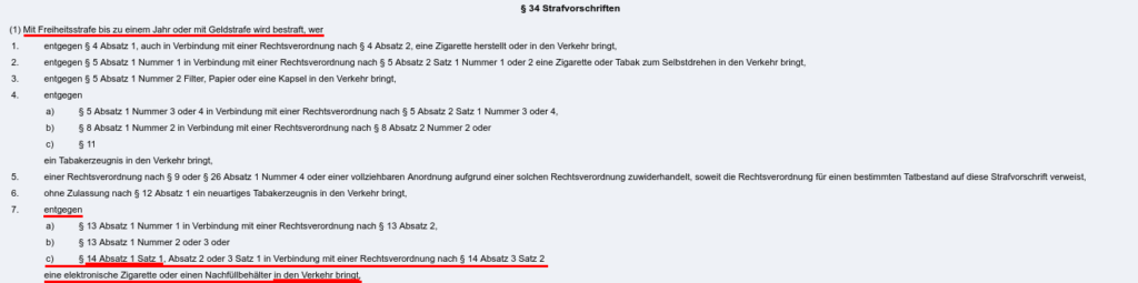 Beachte: Für den Verstoß gegen § 14 Abs. 1 Satz 2 (Nikotingehalt von höchstens 20 mg/ml) verstößt, wird nicht bestraft. Dieser Satz ist weder in den Straf-, noch in den Bußgeldvorschriften erfasst. Trotzdem ist der Verkauf bzw. das Inverkehrbringen nicht erlaubt.