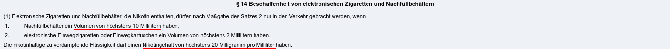Die Regelungen für nikotinhaltige Nachfüllflüssigkeiten sind in § 12 TabakerzG festgelegt.