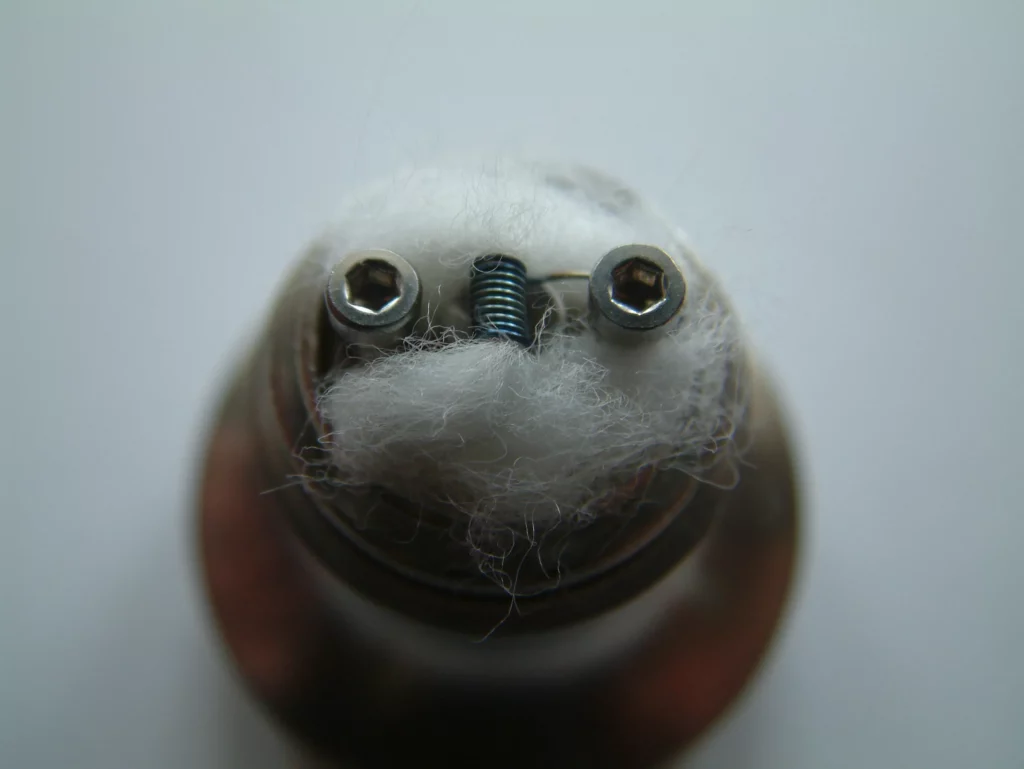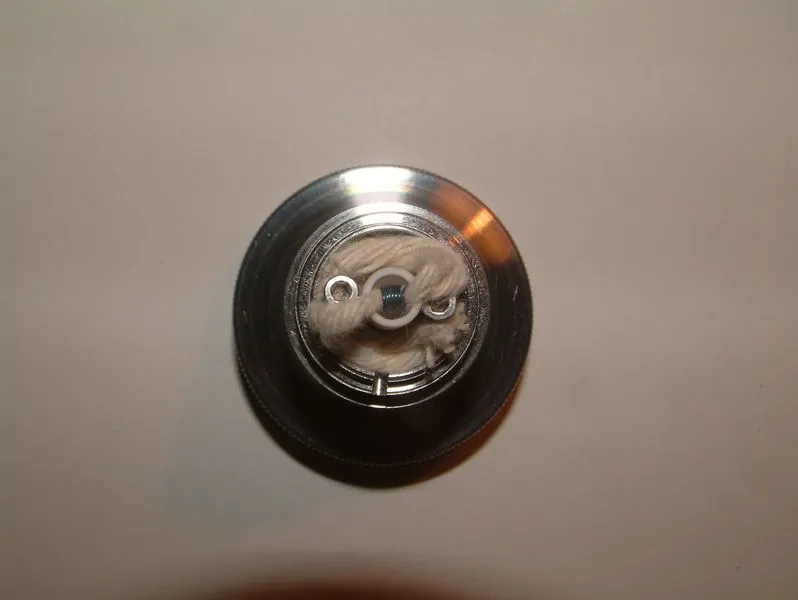 Jetzt zur Praxis! Meine erste Wicklung habe ich mit Keramik gemacht. Eine 2 mm Microcoil aus 0.30 NiCr und 1 Ohm. Die Installation der Wicklung ist ausgesprochen unproblematisch, weil man beim Festschrauben des Heizdrahtes freien Zugang hat. Die Wicklung habe ich mit Baumwoll-Schnur bestückt und – weil ich mir selbstverständlich das Anleitungs-Video angeschaut habe – darauf geachtet, dass die Faser von innen schön anliegend vor der Fräsung positioniert wurde. Auch das ist kein Problem. Man drückt sie einfach mit einem kleinen Gegenstand von Innen gegen den kleinen Rand. Die Faser wird nicht durch die Fräsung geführt. Wenn man diese Regel außer Acht lässt, dann säuft der Verdampfer ab oder die Eviva würde kokeln (bei durchgeführter Faser). Hört sich aber dramatischer an, als es ist. Ist wirklich keine Hexerei. Alle Wicklungen, die ich bisher gemacht habe, waren „absauf-sicher“. Mit der Ein-Ohm-Wicklung und einem voll geladenen Akku im Chi You habe ich sie dann mit gut 17,5 Watt in Betrieb genommen. Das Ergebnis war hervorragend. Sie produziert einen angenehmen dichten und kühlen Dampf, moderaten Throat Hit und einen ganz hervorragenden Geschmack. Man darf bei einem Verdampfer dieser Bauart sicherlich keine Schwaden in Pinoy-Manier erwarten, aber sie nebelt trotzdem sehr ordentlich. Der Geschmack hat mich besonders überzeugt (hatte sowas schon vermutet, wegen der Keramik). Die Eviva liegt nur noch ganz, ganz knapp hinter dem Origen… wenn ich das schreibe, will das schon was heißen. Die Befüllung der Eviva erfolgt von Oben, indem man die Topcap abschraubt und Liquid hinein gießt. Eine Nadelflasche ist nicht erforderlich, der Spalt ist großzügig und so lässt sie sich mit jeder Flasche gut befüllen. Die Befüllung erfolgt bis zum untersten Gewindegang. Füllt man darüber hinaus, besteht die Gefahr, dass man sich beim Zuschrauben Liquid in die Verdampferkammer drückt. Im Anleitungs-Video wird geraten, die Topcap in aufrechter Lage so weit zu zu schrauben, bis der O-Ring Kontakt hat. Dann soll man die Eviva auf den Kopf drehen und die Topcap endgültig fest zuschrauben. Das soll ebenfalls verhindern, dass Liquid in die Kammer gedrückt wird. Ein Versuch ohne Umdrehen führte bei mir zwar nicht zum Blubbern, aber dazu dass die ersten vier, fünf Züge ausgesprochen dünn waren… ein sicheres Zeichen für übersättigte Faser.