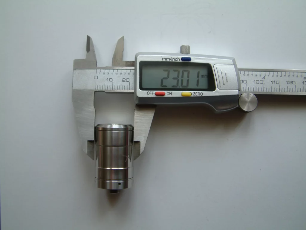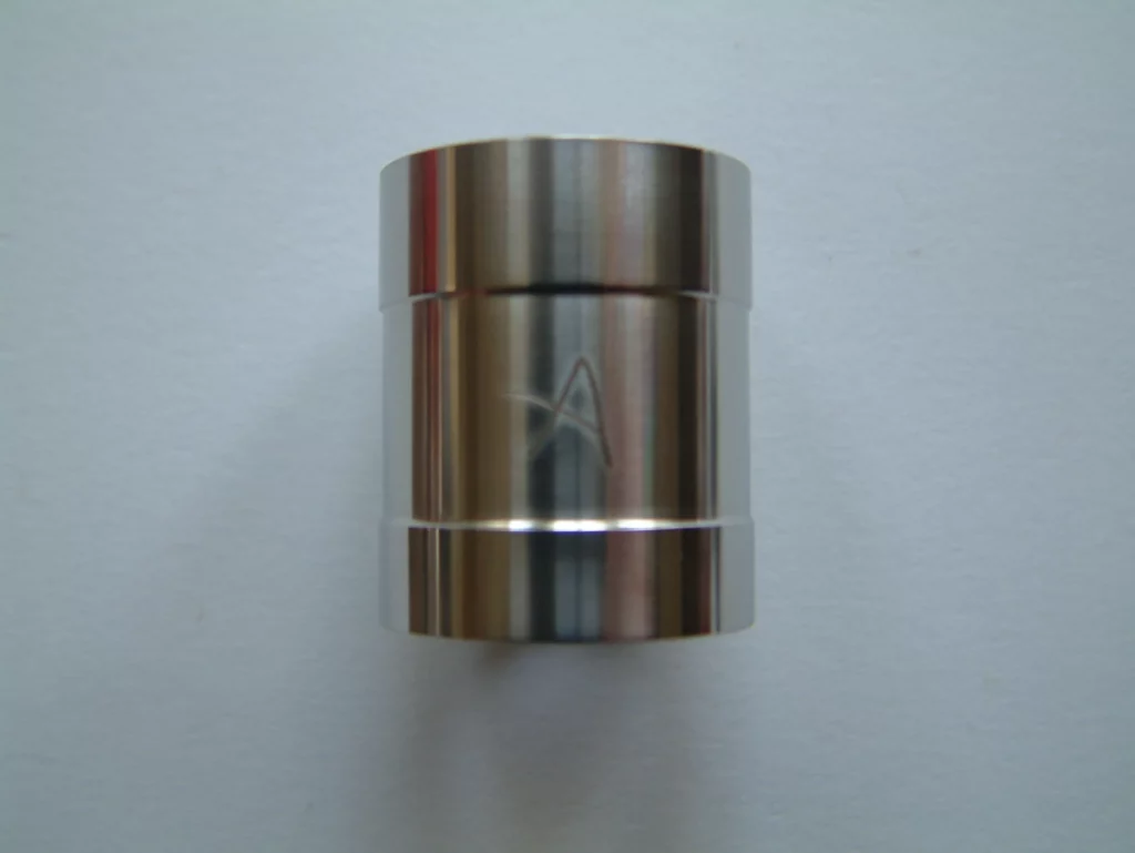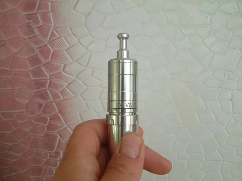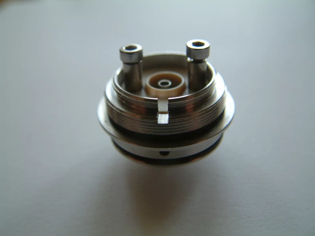 Zunächst mal die nackten Zahlen und Fakten! Die Eviva ist ein recht kompakter Verdampfer mit einem Durchmesser von 23 mm. Damit passt sie wie angegossen z. B. Auf einen Chi You, den sie bei mir schmückte. Auf den Atermon passt sie natürlich noch besser, so man die 23mm-Version sein Eigen nennt. Die Höhe ohne Drip Tip und 510er Anschluss beträgt 36,5 mm (gemessen knapp 37 mm). Sie besteht aus lebensmittelzugelassenem AISI 304L Edelstahl. Der flächige Isolator in der Base ist aus PEEK (Ketron®), einem sehr hitzebeständigen Kunststoff. Zur Fixierung der Wicklung, bzw. zur Lenkung des Zuluft-Stroms, dient entweder die klassische CE2 Keramik, oder ein kleiner Zylinder aus Edelstahl (ES-Housing; die Wicklung wird dann schwebend darüber angebracht und er dient nur dazu, die Zuluft zu kanalisieren). Diese werden in die Base gesteckt und von zwei kleinen O-Ringen gehalten. Der Einsatz der Keramik legt zunächst die Vermutung nahe, man müsse die Eviva mit Kombidrähten betreiben. Dem ist aber nicht so. Die Befestigung des Heizdrahtes erfolgt über zwei Terminals in der Base, die mit Inbus-Schrauben versehen sind.