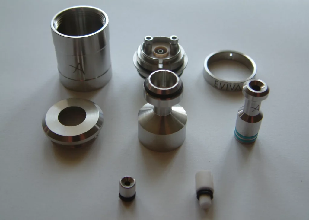 Zur Verarbeitung kann ich sagen, dass ich keinerlei Beanstandungen habe. Die Eviva ist sehr gut verarbeitet, die Gewinde sind sauber und gratfrei geschnitten und laufen butterweich. Insgesamt eine wirklich hochwertige Angelegenheit. Die EVIVA kam im Übrigen komplett gereinigt und damit auch ohne Fremdgeschmack hier an. Im Lieferumfang ist der Verdampfer incl. einer Keramik, ein Inbus-Schlüssel für die Polschrauben und ein Ersatzteil-Set mit einem Satz O-Ringen, einer weiteren Keramik sowie einer Ersatz-Polschraube enthalten. Die Eviva kommt ohne Drip Tip. Es kann jedes 510er Drip Tip verwendet werden. Ein optisch passendes Drip Tip sowie das ES-Housing kann über den Shop bezogen werden. Ebenso Ersatz-Keramiken und die Umbau-Sätze.
