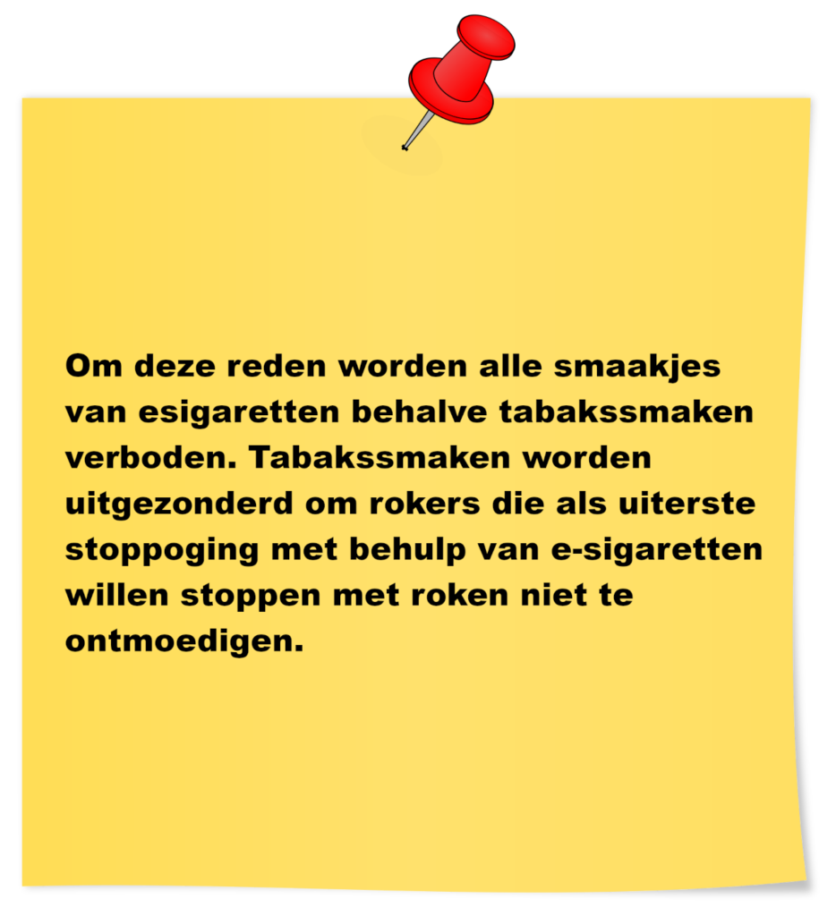 Om deze reden worden alle smaakjes van esigaretten behalve tabakssmaken verboden. Tabakssmaken worden uitgezonderd om rokers die als uiterste stoppoging met behulp van e-sigaretten willen stoppen met roken niet te ontmoedigen.