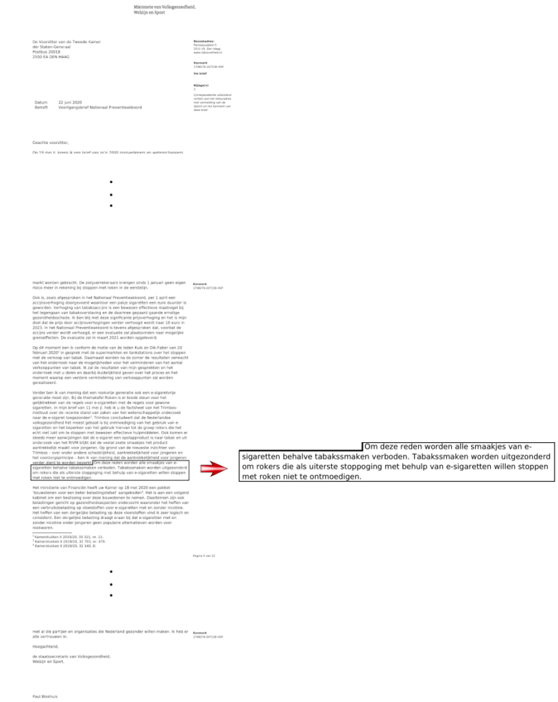 Der verfasste nämlich am 22. Juni 2020 einen „Fortschrittsbrief Nationales Präventionsabkommen“ („Voortgangsbrief Nationaal Preventieakkoord“) an den Präsidenten des Repräsentantenhauses, in dem er (neben dem im Artikel der eGarage erwähnte Plain Packaging) ausführte: