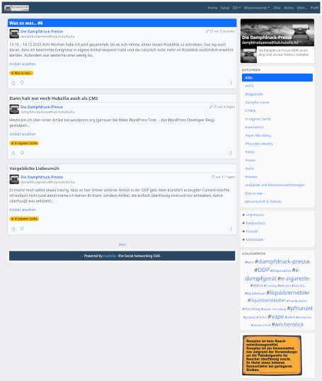 Neu hinzugekommen ist die Kanalseite. Hier wird der aktuelle Fediverse-Stream der Dampfdruck-Presse angezeigt, wo ich auch immer auf neue Artikel verweise, sobald ich sie veröffentlicht habe. Diesem Stream kann man auch mit einem RSS-Reader folgen und man wird immer aktuell informiert, sobald sich in der DDP etwas tut.