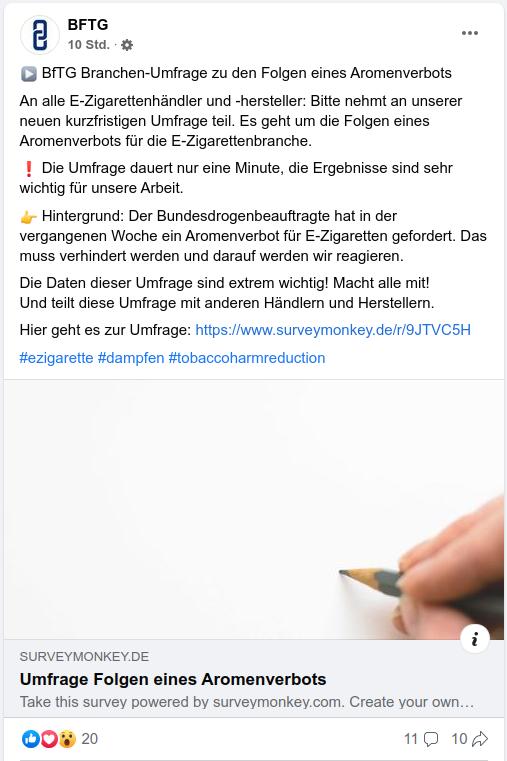 Jetzt brennt der Baum ordentlich und das BfTG startet fix mal wieder eine Umfrage auf facebook an der Händler, aber auch sonst jeder beliebig oft teilnehmen kann. Eingeleitet wird die Umfrage mit einer selten dämlichen Frage. Es wird gefragt, ob die befragten Händler überrascht von dem Aromenverbot Vorstoß des Bundesdrogenbeauftragten sind?
