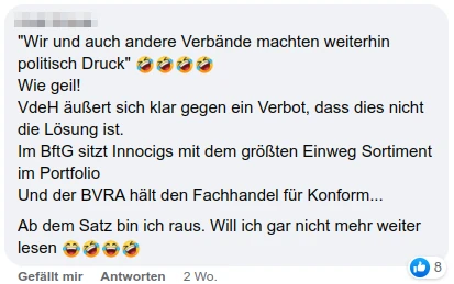 Ernsthaft? Ist das die Antwort? Die Jungspunte kaufen sich also kartonweise von ihrem nicht vorhandenen Taschen- bzw. Azubigeld gleich ganze Sortimente und mehrfach an Elfbars & Co und sonstigen Einweg Schrott. Das bekommen sie nicht von den Herstellern selbst zugesendet? Es ist ja schon peinlich, wenn die Influencer das der Jugend und naiven neuen Kundschaft als Hobby vermarkten wollen, aber das will Dustin Dahlmann jetzt auch noch den politischen Entscheidern weiß machen? Wenn sich da mal niemand ganz gehörig in seiner Intelligenz auf den Schlips getreten fühlt. Zu diesen freiwilligen Selbstvereinbarungen der europäischen Branche (IEVA) und wie gut die funktionieren, das haben und können wir in der Vergangenheit und auch aktuell jeden Tag auf Tik Tok und Co. beobachten. Wenn das alles ist, Dustin Dahlmann, dann reißt doch ehrlicherweise das Dach selbst ab. Das überzeugt nicht mal die Baumschule.