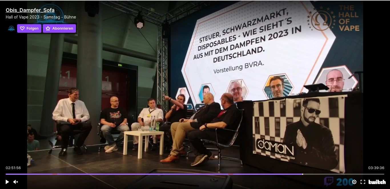 Wie der Moderator Dirk Oberhaus (BVRA Beiratsmitglied) immer noch darauf hinwies, dass der Fachhandel zu 99,9 % korrekt im Bezug auf Einweg E-Zigaretten ist und so eine realitätsfernen Blickwinkel auf das Thema einnehmen kann, während er auf der Hall of Vape sitzt (das ist auch Fachhandel und Point of Sale für Endkonsumenten und keine „Geheimbund Veranstaltung“) und der Zoll wagenweise Stände leergeräumt hat, ist sehr fragwürdig. Auch wie er in Frage stellen kann, ob es die Aufgabe der Branche ist, den Markt sicher zu halten, zeigt einen dürftigen Kenntnisstand nach mehreren Jahren Tabakerzeugnisgesetz. Dirk Oberhaus hat als Moderator – wenig überraschend – verpasst, Oliver Pohland zu fragen, welche Anstrengungen denn die nicht konformen Produkte betreffend vom Verband konkret unternommen wurden. Der Kassenwart Markus Ense war immer noch mit der Steuer befasst. Das Thema kann sich in voller Länge auf Obis Dampfer Sofa auf Twitch angesehen werden. Zu Produktsicherheit, Einweg E-Zigaretten gab es spärliche Aussagen. Druck auf die Einweg Branche sieht leider völlig anders aus.