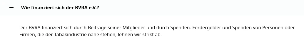 Der BVRA finanziert sich durch Beiträge seiner Mitglieder und durch Spenden. Fördergelder und Spenden von Personen oder Firmen, die der Tabakindustrie nahe stehen, lehnen wir strikt ab.