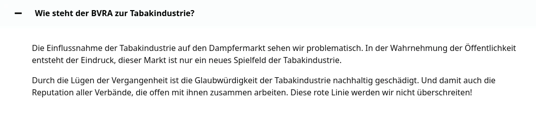 Sicherlich ist das im Vergleich zu dem, was sonst an Filz und Geldflüssen stattfindet, lächerlich… aber die Gegner können trotzdem belegbar behaupten, auch der BVRA lässt sich von Big-T bezahlen. Das kratzt mehr als nur ein wenig an der Glaubwürdigkeit, was die Ferne zur Tabakindustrie anbelangt.