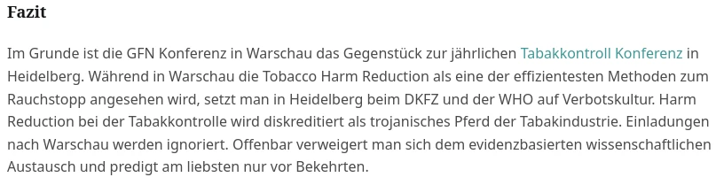 Im Grunde ist die GFN Konferenz in Warschau das Gegenstück zur jährlichen Tabakkontroll Konferenz in Heidelberg. Während in Warschau die Tobacco Harm Reduction als eine der effizientesten Methoden zum Rauchstopp angesehen wird, setzt man in Heidelberg beim DKFZ und der WHO auf Verbotskultur. Harm Reduction bei der Tabakkontrolle wird diskreditiert als trojanisches Pferd der Tabakindustrie. Einladungen nach Warschau werden ignoriert. Offenbar verweigert man sich dem evidenzbasierten wissenschaftlichen Austausch und predigt am liebsten nur vor Bekehrten.