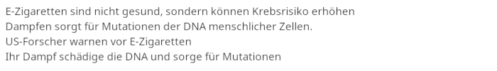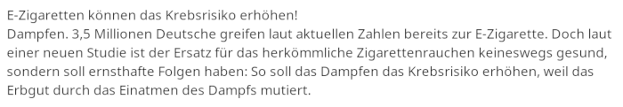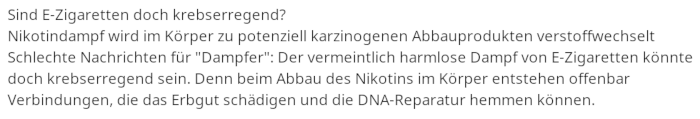 Auch wenn es, wie gesagt, einige Medien gab, die ausgewogen darüber berichtet haben… und auch wenn es Äußerungen über die Mängel der Studie und die unzulässigen Schlussfolgerungen aus berufenem Munde gibt… und wenn es sogar ausgezeichnete Artikel, die die Meldung demaskieren (hervorragender Artikel bei vapers.guru) gibt, bleibt doch IMMER was hängen.
