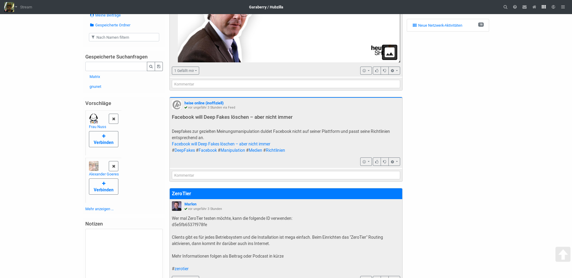 „The Federation“ ist der geeignete Ort. Damit sind die dezentralen freien Netzwerke gemeint, die YouTube, Instagram, Facebook, Twitter und etliche andere zentrale Dienste ersetzen können. Der Vorteil dabei ist, dass die verschiedenen Dienste eben nicht zentral auf einem Server laufen, sondern auf zahlreichen Servern, die untereinander interagieren, sodass man die Inhalte aller Instanzen sehen kann, wenn man auf einem beliebigen Server angemeldet ist. Man sieht die Inhalte aller (ziemlich aller), kann sie direkt anschauen und auch darauf reagieren. Das besondere ist, dass sogar die unterschiedlichen Plattformen in weiten Teilen miteinander interagieren… also z.B. der Twitter-Ersatz Mastodon mit dem Facebook-Ersatz Hubzilla…