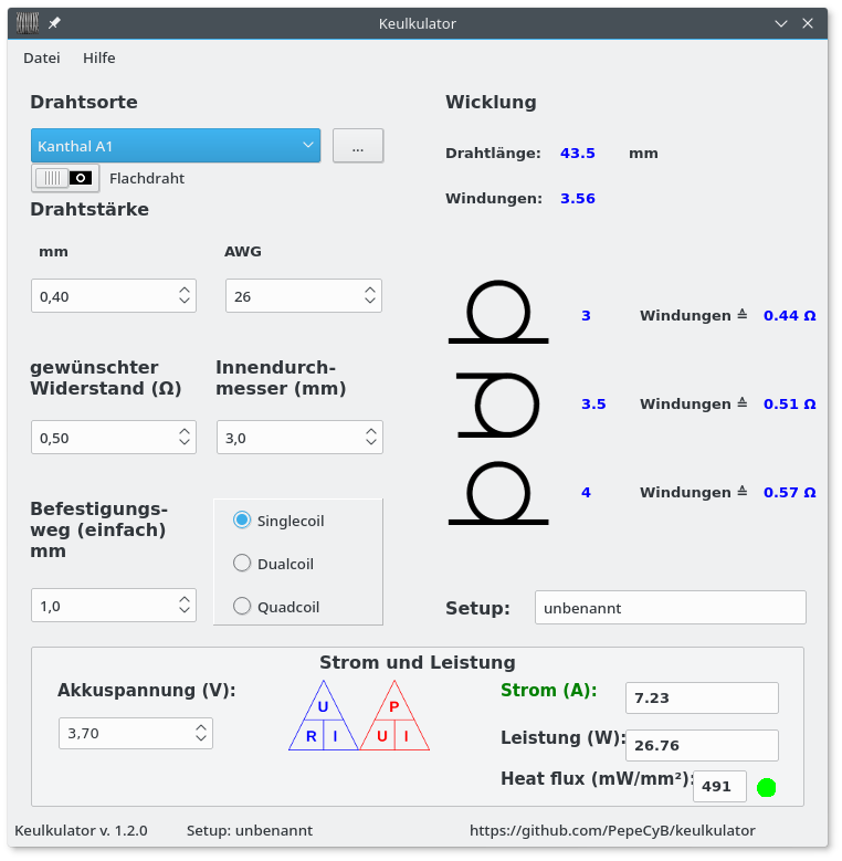 Es können Materialien (Stand 15.01.2020: Kanthal A1, Kanthal A, Kanthal D, NiChrome N80, Nickel 200, V4A, V2A und Titan), Drahtstärke (mm und AWG), gewünschter Widerstand der Wicklung, Innendurchmesser der Wicklung und Befestigungsweg (Abstand Wicklung zu den Anschlussposts, WICHTIG: nur einfachen Weg eingeben), sowie die Anzahl der Coils (single, dual, quad) ausgewählt werden. Die Berechnung erfolgt sofort bei jeder Änderung eines Parameters. Die Berechnung von Wicklungen mit Rund- und Flachdraht sind möglich.