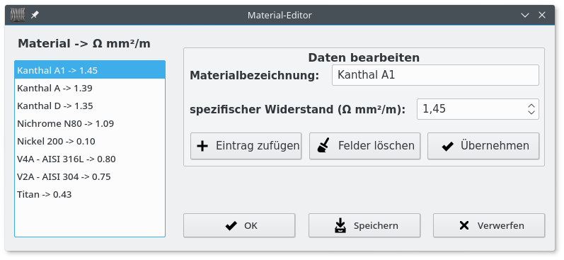 Die Parameter eines in der Liste ausgewählten Materials können geändert werden. Die Änderungen werden mit dem Button „Übernehmen“ übernommen.