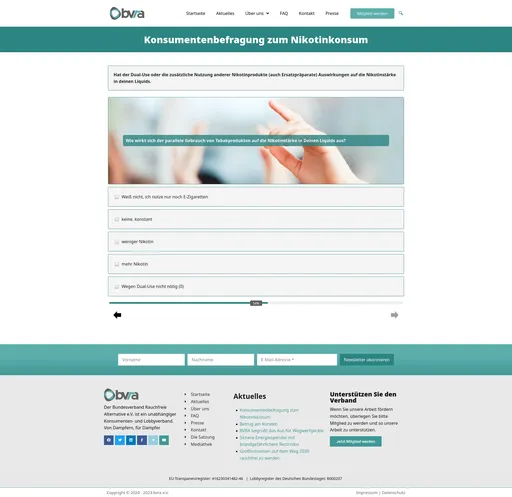 Die ersten drei Fragen sind recht unverfänglich und die dritte (nach der Nikotinstärke des Liquids beim Einstieg) sogar ganz interessant. Das kann Argumente gegen eine – der Flurfunk hat was aufgeschnappt – kommende weitergehende Beschränkung der maximalen Niktinstärke liefern.