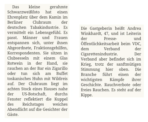 Die Tabaklobbyisten kriegen auch nicht alle naselang Raum ihren Dunst in den Mainstream Medien abzulassen. So ein Interview wird garantiert nicht für Luft und Liebe abgetippt.