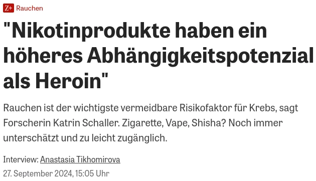 Das ist finsterstes DKFZ-Mittelalter. Es ist inzwischen wissenschaftlicher Konsens, dass das Abhängigkeitspotential von Nikotin ungefähr auf dem Level des Abhängigkeitspotentials von Koffein liegt. Selbst bei Wikipedia steht inzwischen: „Ein Vergleich mit der Sucht nach Opiaten wie Heroin ist nicht angezeigt, weil die Entzugserscheinungen schwerwiegender sind.„1