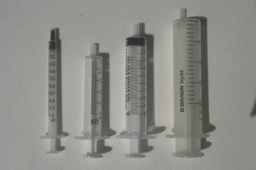 Um nun solche relativ kleinen Mengen vernünftig abzumessen, kann man nicht den Messbecher aus der Küche nehmen. Es hat sich etabliert, dafür Spritzen zu verwenden. Die gibt es in verschiedenen Größen. Es empfiehlt sich, eine Spritze mit 25 ml oder 10 ml für das Abmessen der Base zu besorgen, dazu vielleicht noch eine mit 5 oder 3 ml und für die Zugabe der Aromen sind Insulinspritzen (aber nicht mit Einheiten-, sondern mit ml-Skala) hervorragend geeignet. Die haben dann ein Fassungsvermögen von 1 ml und eine Skala, die in 0.01 ml unterteilt ist. Wenn man verschiedene Aromen verwendet, sollte man sich auch die entsprechende Anzahl solcher Spritzen besorgen, um Nebeneffekte zu verhindern.