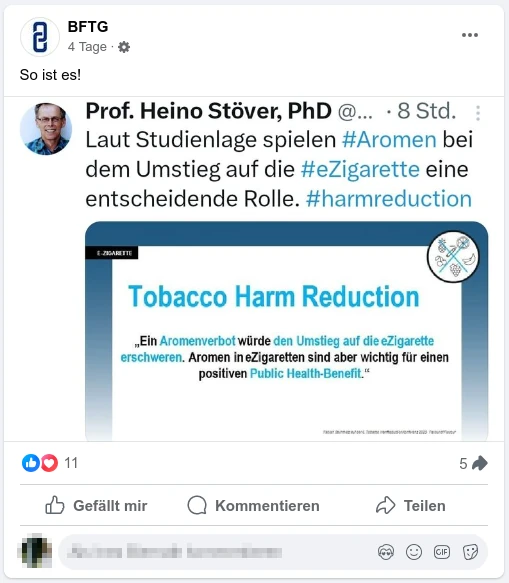 Das BfTG derweilen bei Facebook: „So ist es!“ zu einem Zitat von Stöver: „Laut Studienlage spielen #Aromen bei dem Umstieg auf die #eZigarette eine entscheidende Rolle. #harmreduction„