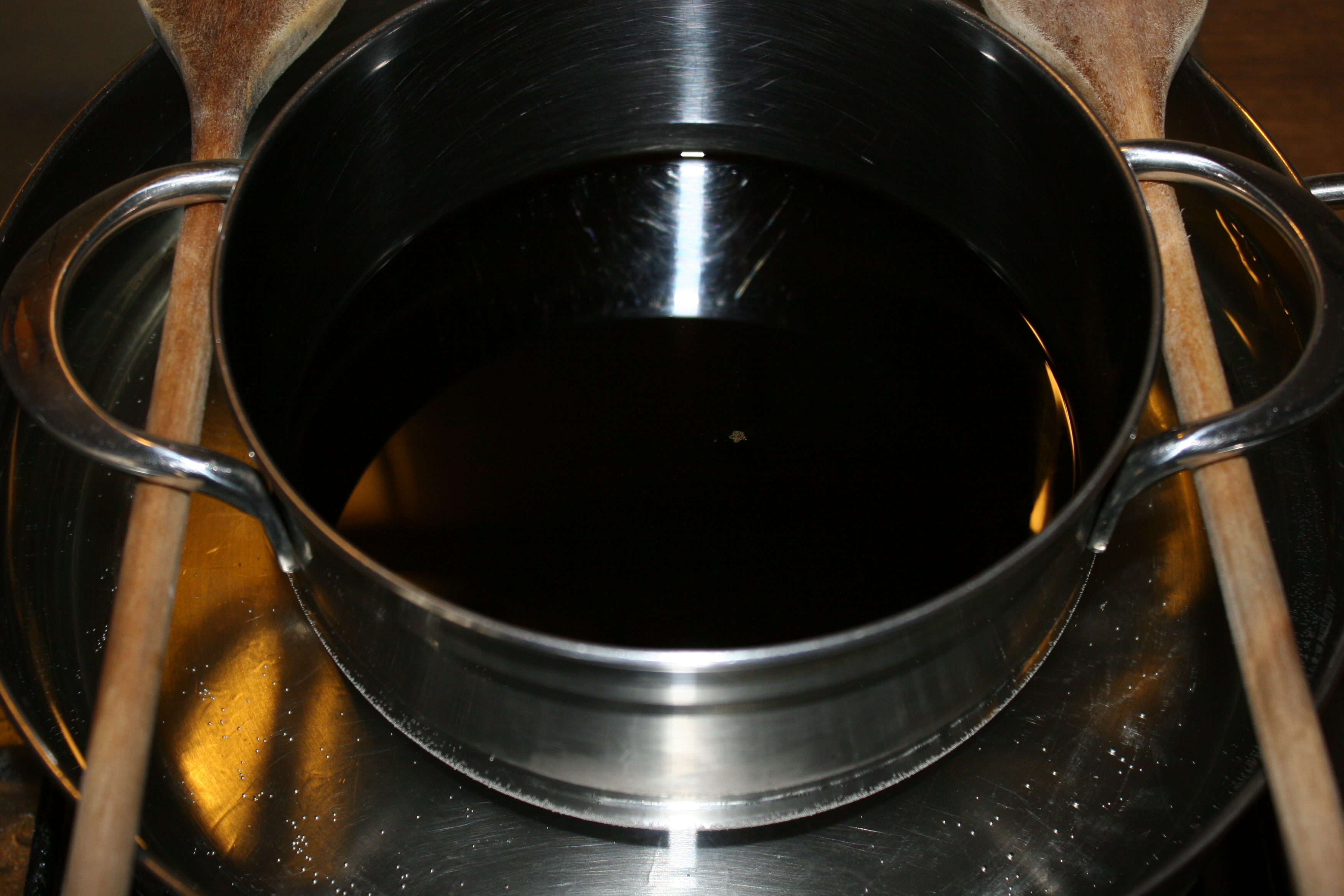 locker einen halben Arbeitstag in Anspruch nimmt. Der Siedepunkt von Ethanol liegt bei 78,32° C, weshalb ich den Extrakt in einem Topf erneut im Wasserbad erhitzt habe… und zwar möglichst genau auf 80° C. Auch hier war regelmäßiges Rühren erforderlich. Anfangs war eine deutliche Blasenbildung (wie bei Sprudelwasser) zu erkennen, die anzeigte, dass das Ethanol verdampft und nach oben steigt. Nach ungefähr drei bis vier Stunden stellt man fest, dass die Bläschen immer weniger werden. Auch der typische Alkohol-Geruch ist dann kaum noch feststellbar. Ich habe das aber trotzdem noch eine Zeit lang „köcheln“ lassen, bis ich mir ziemlich sicher war, das Ethanol ziemlich gründlich entfernt zu haben.