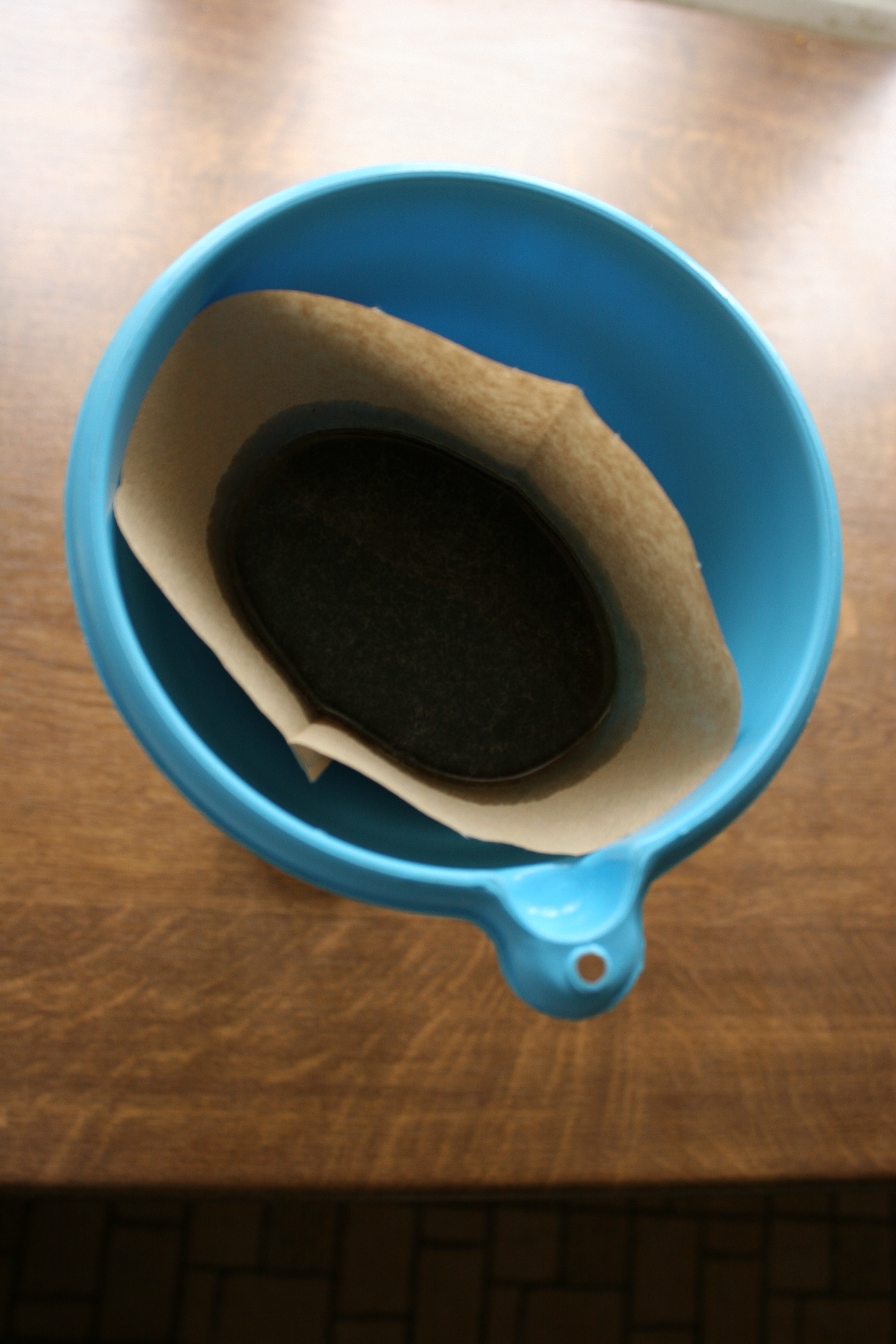 Zum ersten Trennen des Tabaks vom Lösungsmittel habe ich einen handelsüblichen Damen-Feinstrumpf verwendet. Der Brei wurde über einer Rührschüssel in den Stumpf gegossen und anschließend wurde die „Matschepampe“ im Strumpf ordentlich ausgewrungen. Das verbleibende „Sauerkraut“ habe ich samt Strumpf entsorgt. Der dunkle Extrakt wies einen deutlichen Geruch nach Ethanol auf… das musste also nun raus… aber zunächst musste gefiltert werden, um möglichst alle Schwebstoffe aus der Flüssigkeit zu entfernen (schließlich wollte ich ja keine Panade auf der Heizwendel… selbst wenn ich den Extrakt stark verdünnt verwende).