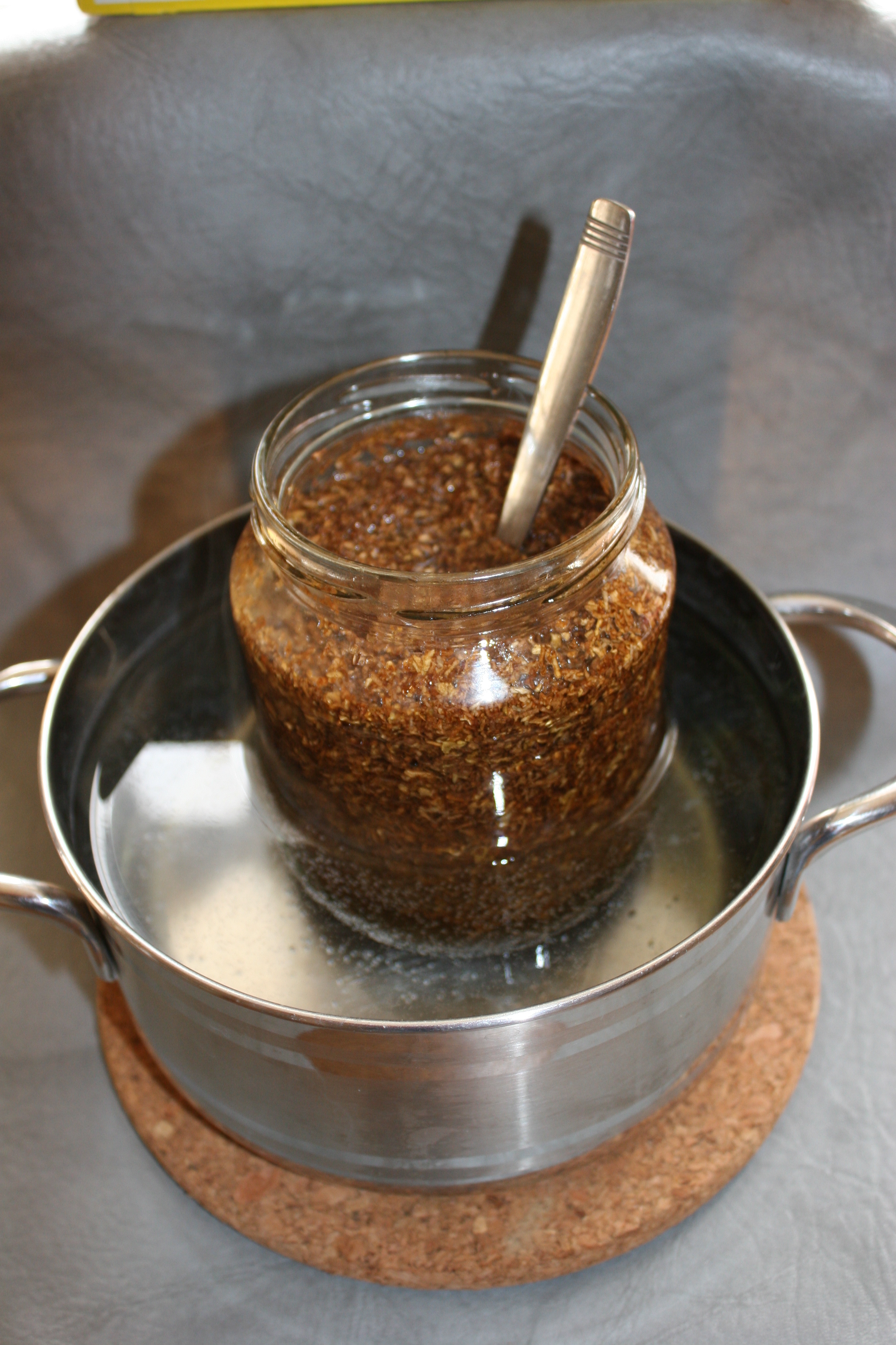 ein leeres Einmachglas getan hatte, damit aufgegossen. Anschließend kam das Einmachglas ins Wasserbad und das Lösungsmittel wurde auf ca. 80° C erhitzt. Zwischendurch habe ich den nassen Brei regelmäßig mit einem Löffel durchgerührt. Nachdem die 80° C erreicht waren, habe ich den Topf für das Wasserbad von der Flamme genommen und unter regelmäßigem Umrühren auf Zimmertemperatur abkühlen lassen. Dann nur noch den Deckel aufgeschraubt und das Glas (ebenfalls bei Zimmertemperatur) in einen Schrank gestellt.
