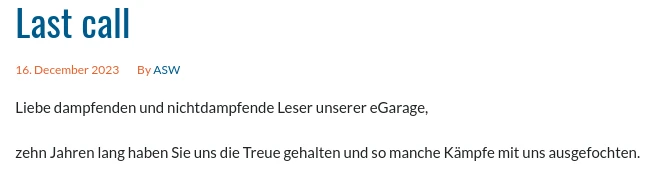 in welchem mitgeteilt wird, dass aus Sicht der Herausgeber / Autoren „fast alle Storys erzählt sind“, weshalb das Projekt eGarage zum Jahresende eingestellt wird.